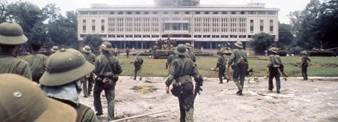 12 giờ 5 phút, một xe jeep chạy tới đường Catinat, trên xe cắm lá cờ VC lớn, trong khi nhiều xe tăng tới chiếm Dinh Độc Lập. Cờ VC được trưng lên trước tiền đình. Một chiếc T-54 húc tung cánh cửa sắt vì người ta chậm mở cửa, rồi bắn một phát đại bác và vài tràng súng đại liên để thị oai. 14 xe tăng khác theo sau, pháo tháp mở , cành cây cắm đầy xe. Binh lính đội mũ lợp lá theo kiểu mũ thuộc địa, quân phục xanh và đi dép HCM chế tạo bằng võ xe hơi, võ trang bằng tiểu liên AK-47 của Trung quốc, nhẩy ra khỏi xe tăng, chạy vào Dinh.